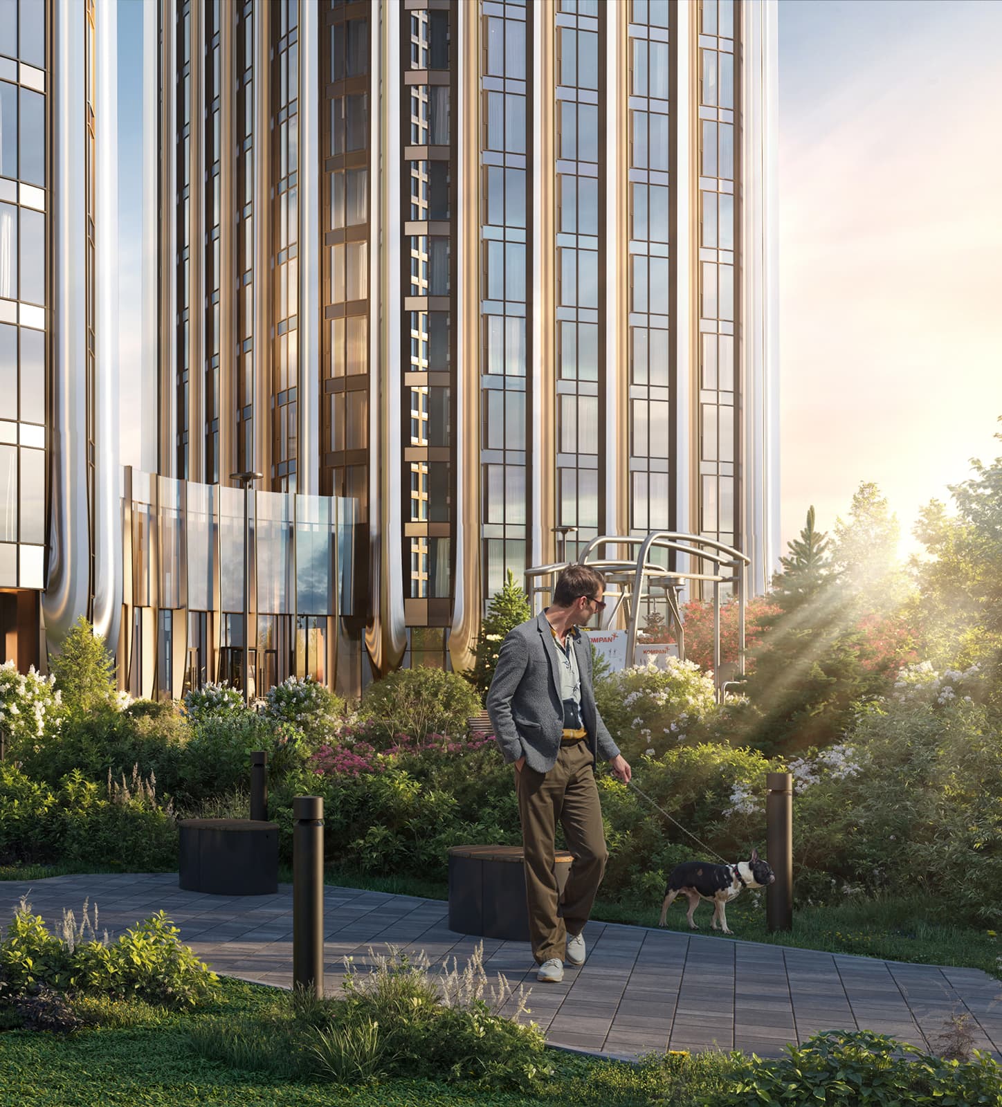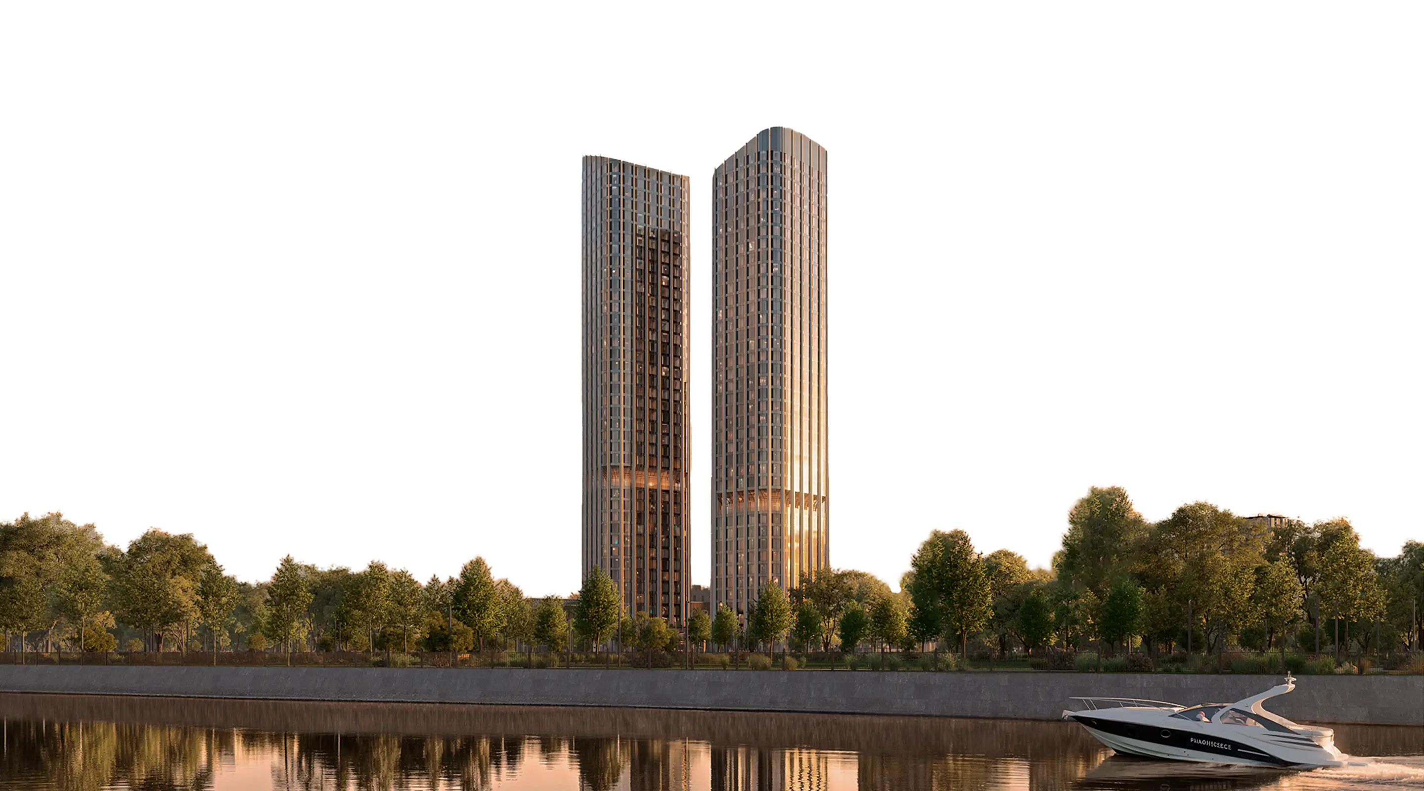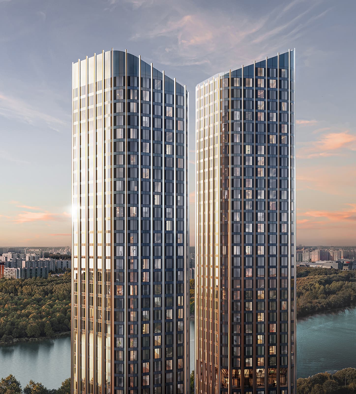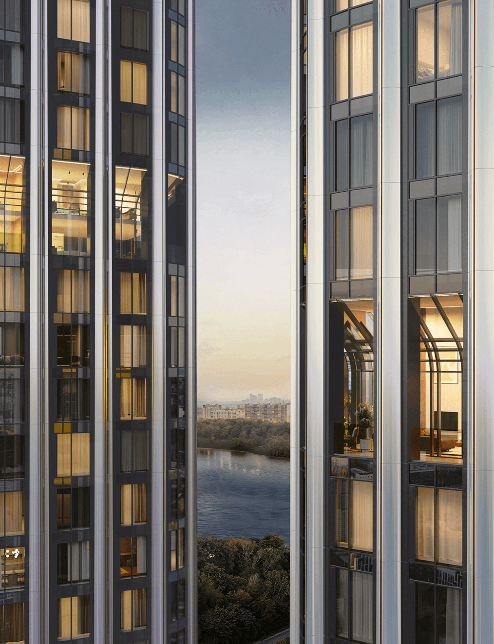 Этажи расположены в нижней трети башен. Именно здесь фасады делают легкий изгиб, повторяя линию реки. Архитектура «вплывает» в панораму — и обратно. Эстетика, которую не хочется прерывать.